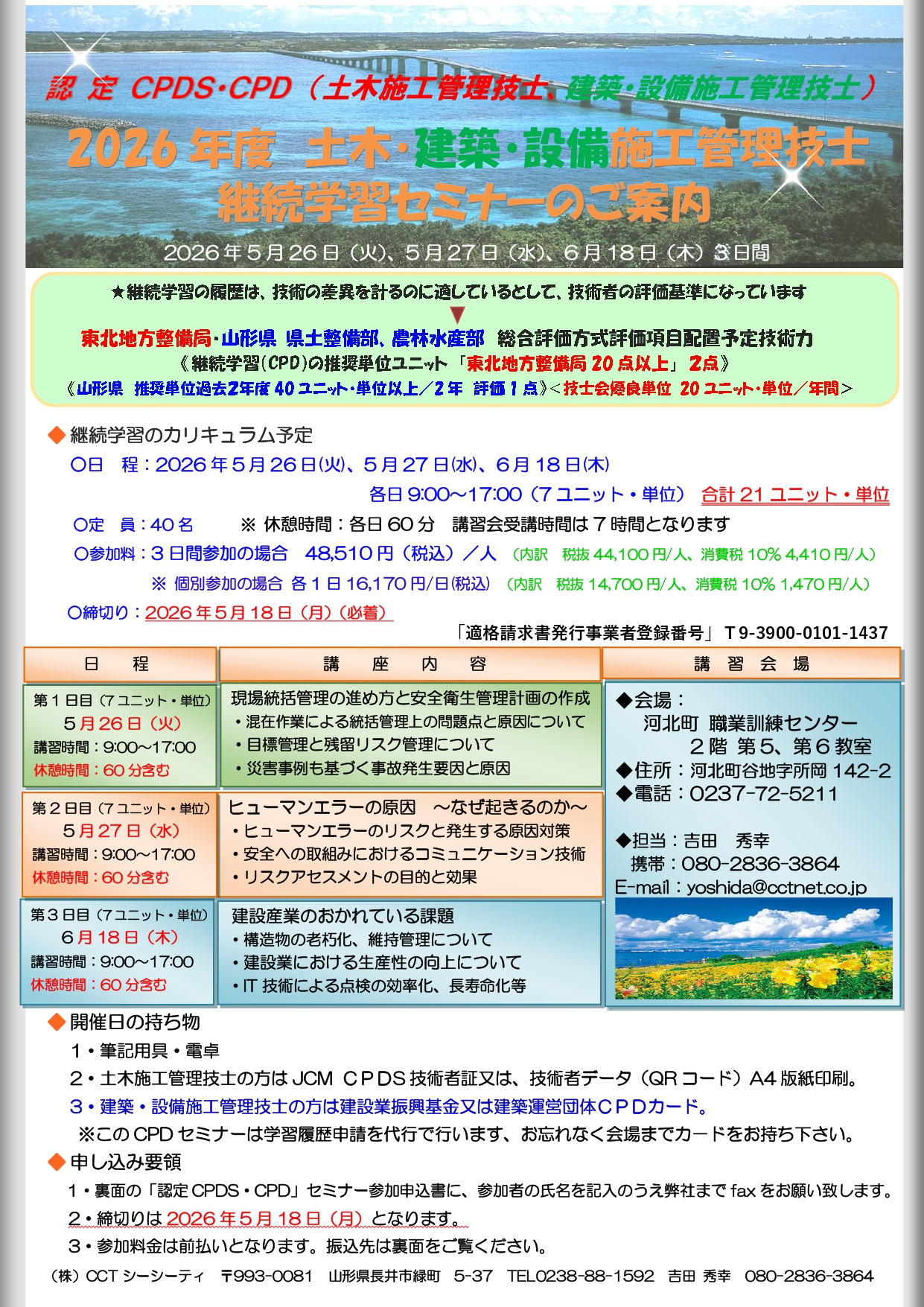 対面セミナー 開催日:5月26日(火)、5月27日(水)、6月18日(木)2026年度 土木・建築・設備施工管理技士 継続学習セミナーのご案内 ※上の画像「ご案内チラシはこちら」からでもご確認いただけます。 ご案内チラシはこちら 申し込み書はこちら Tweet Share 開催日:6月2日(火)、6月3日(水)、6月24日(... 開催日:4月24日(金)、5月22日(金)、6月5日...
